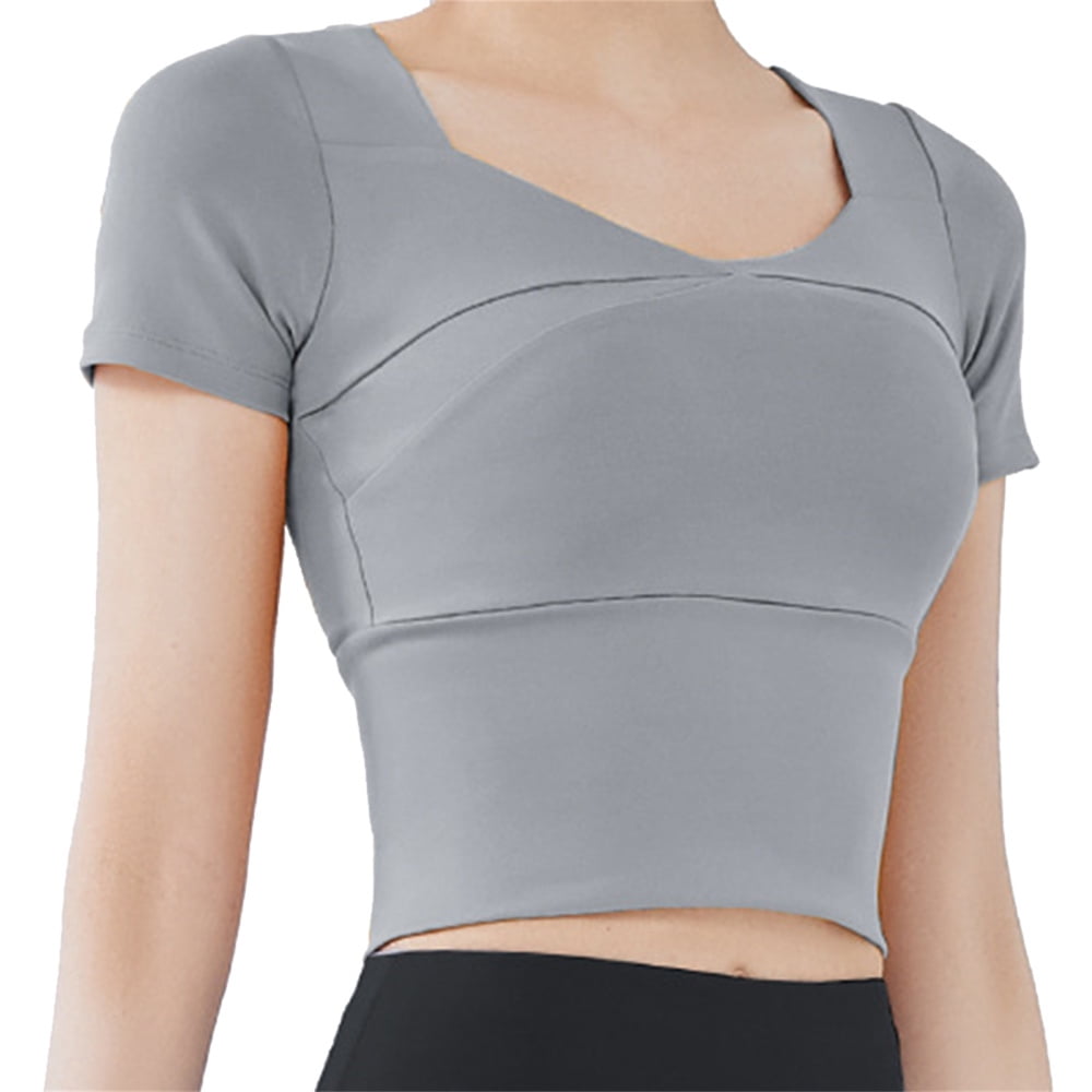 Women S Slim Fit Workout Tops Quick Dry Short Sleeve T Shirt Built In Chest Pad Athletic Shirts Solid Color V Neck Tee For Girls Ladies Open Navel Yoga Shirts L Sea Rock Grey
